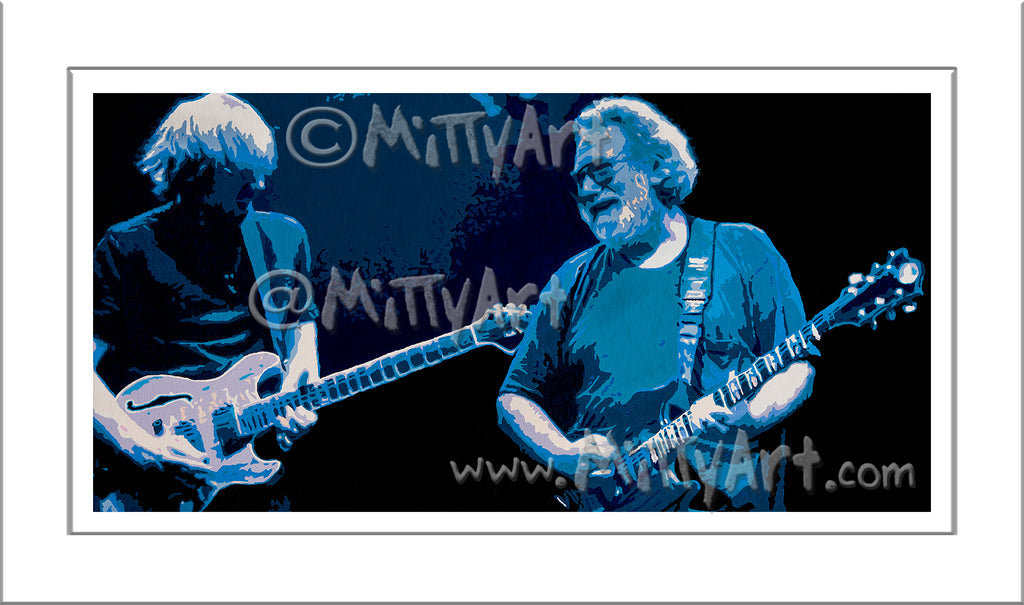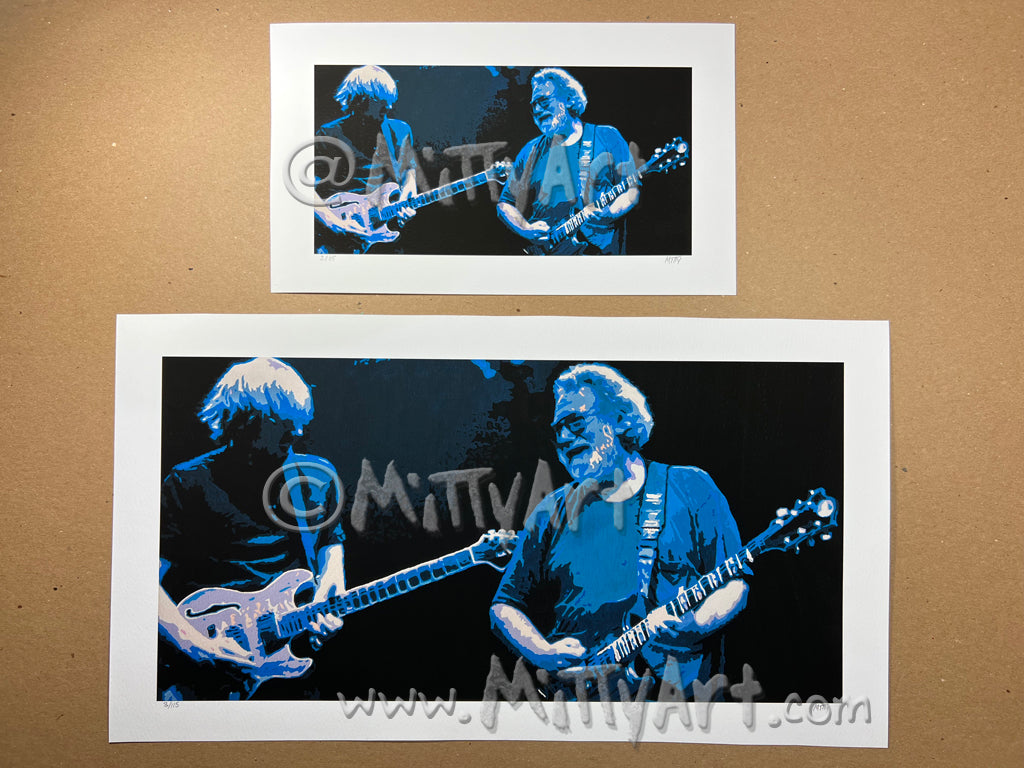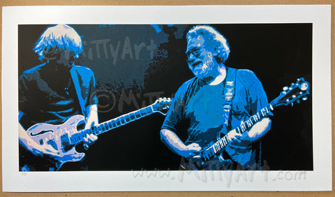 The original is 12"x24" acrylic on 3/4" wrapped canvas. I painted this for myself leading up to GD50, the 50th anniversary Grateful Dead shows at Soldier Field in Chicago in 2015. With Trey Anastasio billed as the guitarist for the shows I wondered, "What If?" What if Trey played with Jerry Garcia. It's currently hanging on my wall in my living room. While I'm not planning on selling the OG, if you wanna try and make me an offer I can't refuse I'll listen. Hit me up here if you think you can sway me!