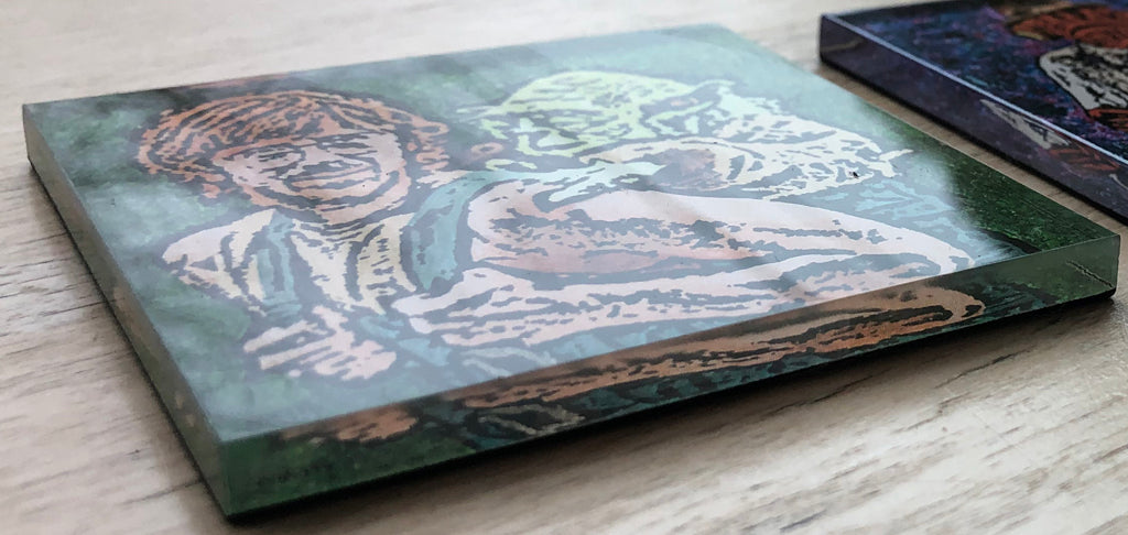 These acrylic magnets are 1/4" thick x 3" x 3". This magnet features my original painting titled Treyning.